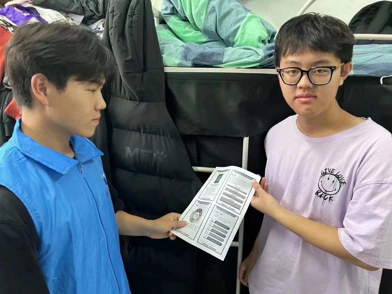 志愿宣传队深入学生寝室,为同学们分发相关学习资料。这种面对面的交流和互动让五四精神更加生动具体地展现在同学们面前,成为激励青年学子奋发向前的强大动力。