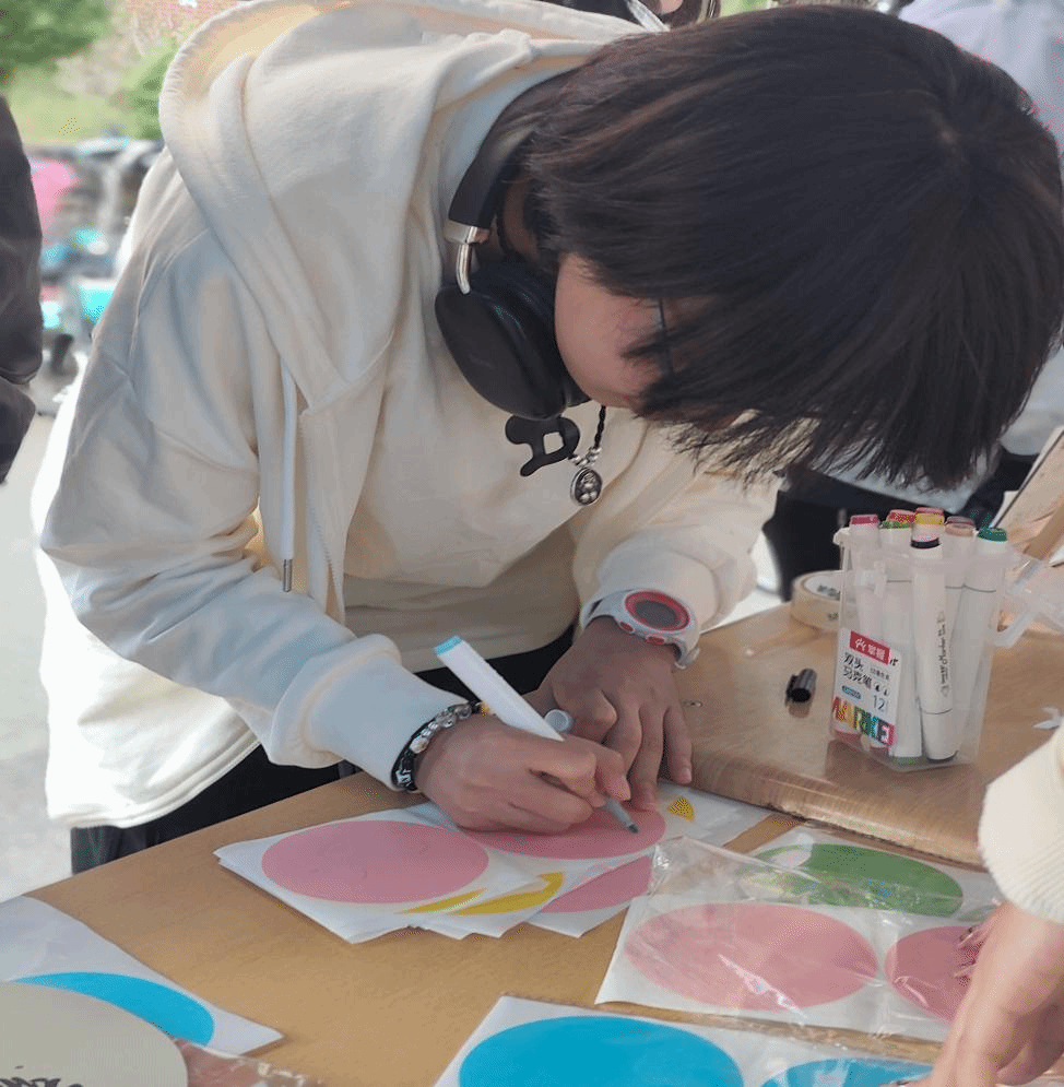 另一项备受瞩目的活动是“心绘之展”。同学们领取圆形贴纸与马克笔,在贴纸上描绘出内心深处的自我或梦想中的模样,并将贴纸粘贴于展板之上。活动鼓励学生们通过绘画进行自我表达,深入探寻内心世界,进而深化对自我的认知,接纳并欣赏自我。
