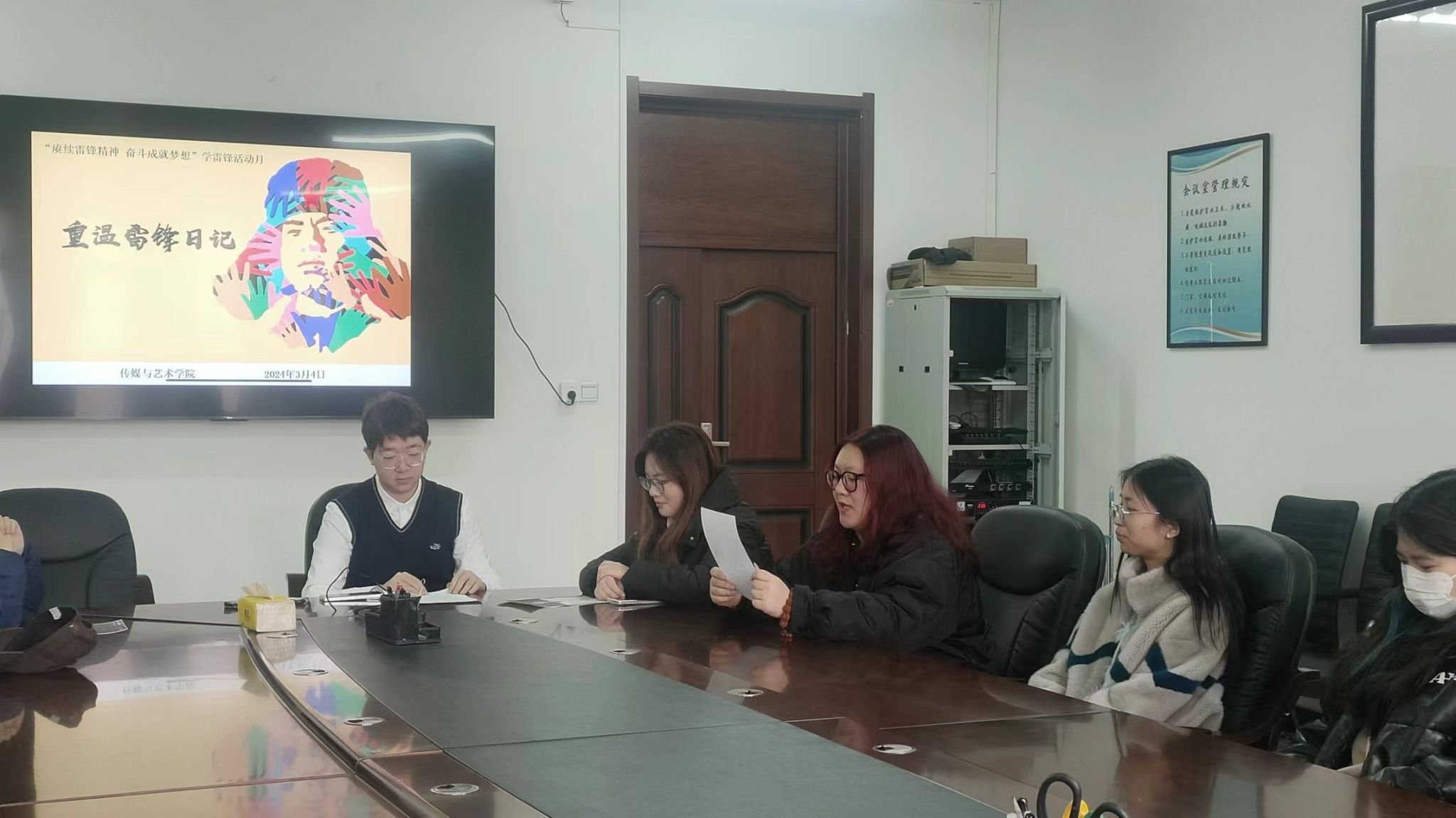 在文轩楼406组织开展“重温雷锋日记”座谈会,通过学生代表朗读雷锋日记、观看短片和谈心得体会等方式,深入了解雷锋的生平,学习雷锋艰苦奋斗的精神。