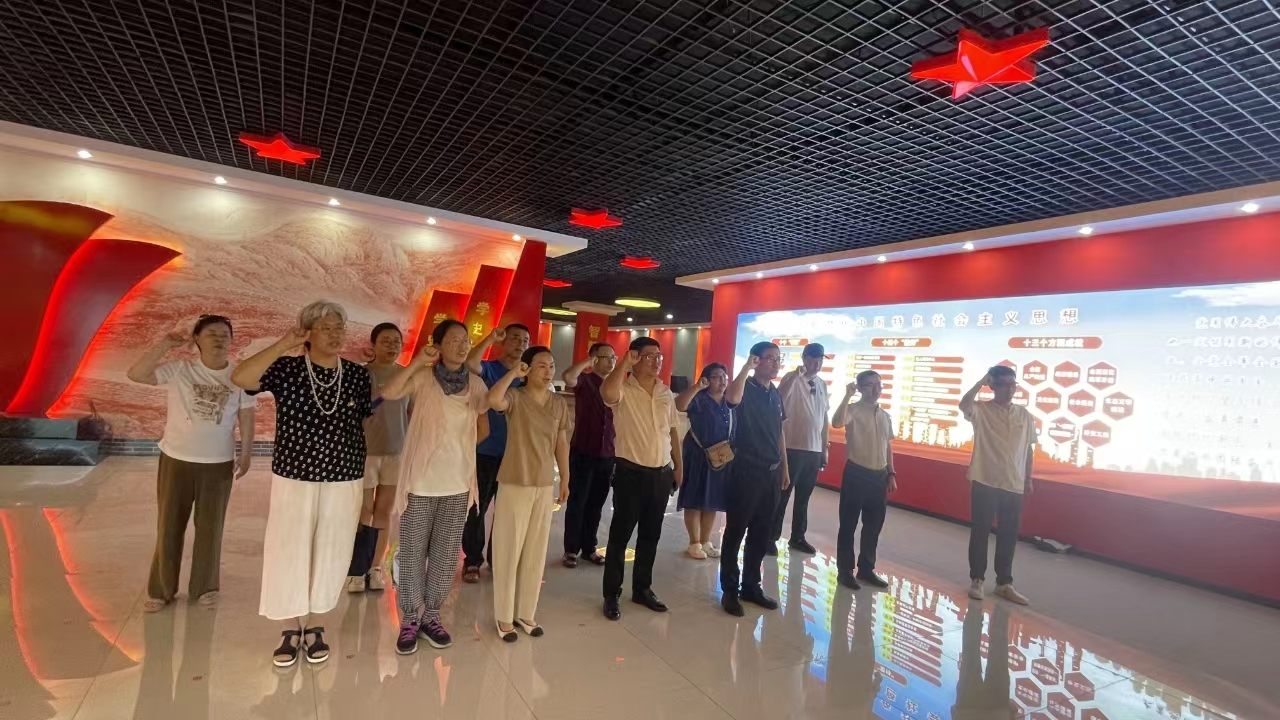 教工党支部组织全体教工党员和部分党外知识分子来到阜新黄家沟“红色记忆“综合教育实践基地,伴随着基地讲解员生动地讲解,广大教师深度学习了建党百年的艰辛历程,感悟了伟大建党精神;馆内收藏了大量我党早期的红色报刊,通过报纸进一步了解建党百年的峥嵘岁月;通过馆内“党的二十大”主题墙内容的学习,进一步激励同志们践行党的二十大精神,携手奋进新时代。在展馆里,教师们还沉浸式体验了党建“e”站VR主题场景。最后,全体教师党员在教工党支部书记陈勇华的带领下重温了入党誓词。