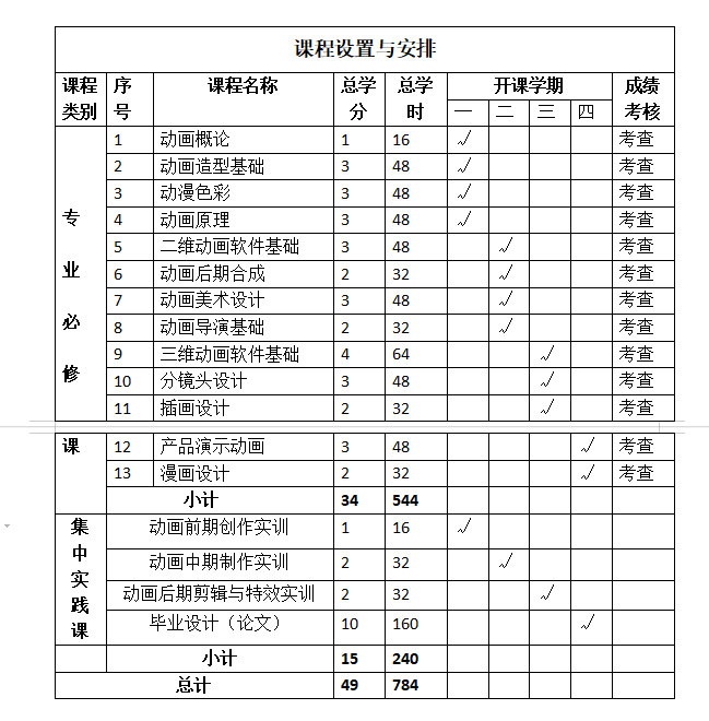 动画概论、动画造型基础、动漫色彩、二维动画软件基础、分镜头设计、动画原理、动画美术设计、动画导演基础、三维动画软件基础、动画后期合成、产品演示动画、插画设计、漫画设计、动画前期创作实训、动画中期制作实训、动画后期剪辑与特效实训、毕业设计(论文)共17门课程。