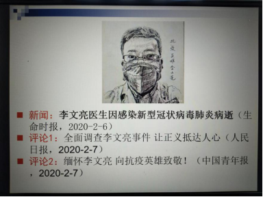 智育教学有形,德育育人无声。线上教学受制于时间和空间的限制,往往难以发挥课堂教学“言传身教”的德育功能。这就需要授课教师精心设计教学内容,重新探索互动方法,构建新型教学关系。以《新闻评论学》课程为例,王胜源老师不仅做足课堂教学预案,同时采用“雨课堂+QQ群课堂”的在线教学方式,有效保障了师生之间课上课下的充分互动;新冠疫情中涌现出来的优秀评论作品,如《全面调查李文亮事件 让正义抵达人心》(人民日报,2020-2-7),也被他及时纳入教学案例。同样是王胜源老师的《传播学概论》课程,他会围绕时事热点设计随堂及课后作业,训练学生应用传播学理论分析、表达社会传播现象的能力。如针对“传播障碍和传播隔阂”这样的理论概念,他布置的作业题目是“请例举新冠肺炎疫情这一公共卫生事件中的传播障碍与传播隔阂,并作解释。”而一些课前课后的问候和鼓励,也让这样的网络课堂不仅传递给学生专业知识,也传递着朴素的善意待人、乐观姿态和敬业精神。