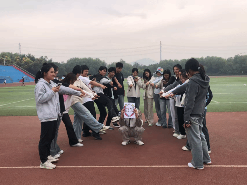 活动开场以班级为单位划分阵营,“团队共创”环节率先升温,围绕“起队名、设计队徽、选队歌”,大家打破陌生感踊跃献策,“对对对”“超人队”等充满朝气的队名频出;手持彩笔的同学接过白纸,在同伴讨论中,将协作的齿轮、梦想的翅膀、成长的星星等理念绘成队徽。独特的团队标识与昂扬队歌,在协作中凝成班级专属记忆。