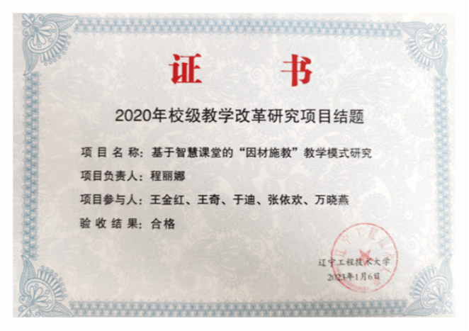 • 2023年完成校级项目《基于智慧课堂的“因材施教”教学模式研究》。