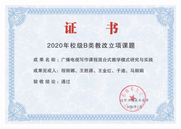 • 2020年完成校级教改课题《广播电视写作课程混合式教学模式研究与实践》(B类结题)。